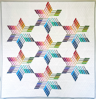 Zetus Lapetus is an original design by Matthew Friesz of TheQuiltyArchitect. The phrase “Zetus Lapetus” is an expression from a 90s movie that partially takes place in space. The phrase is used to express surprise and joy, a fitting expression for this spiral-galaxy-like design. The stars in this quilt feature all 30 colors of the Ombré Galaxy fabric line by Vanessa Christenson for Moda. The background is Bella Solids in off-white, also by Moda. The quilt is backed and bound with Speckled fabric in Dove by Rashida Coleman-Hale for Ruby Star Society.
