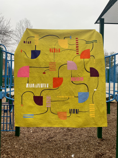 The traditional drunkard’s path block meanders its way around this quilt, performing the role of slide at the playground among ladders, bridges, platforms and monkey bars. Bright, kid-friendly colors pop on a background of Kona Pickle to give this block a thoroughly modern treatment.