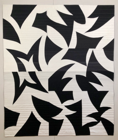 For this figure-ground study in black and white I created several blocks of different mirrored images as a starting point. The curved lines and pointed corners of the freehand cut shapes create movement, while swapping some of the dark and light shapes and adding additional motifs in the final composition dilute the distinction between foreground and background. Using all white and all black thread across all elements in each half of the quilt further shifts the focus between dark and light, and creates the illusion of depth through the gradually narrowing and widening of the quilting lines.