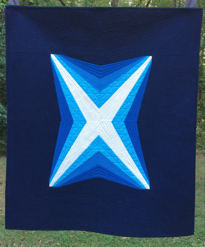 I found my people when I attended my very first QuiltCon event in 2017 and I’ve never looked back! I love to participate in the challenges for QuiltCon each year and the chance to celebrate the tenth anniversary of the first show provided a great opportunity to play with a large scale paper pieced block. The Initial versions of the block brought all the points together to one spot. While it looked good on paper, the giant traffic jam of fabric didn’t work well in practice. After a bit of rework, the final design, color placement and quilting help the center X to jump to the front. Happy Anniversary QuiltCon!