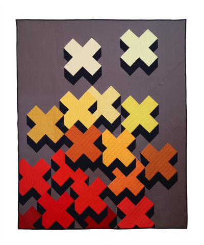 This quilt is inspired by the homonymous film by Tim Burton, hence the reason why I use the color red gradient to yellow for the X's. In this quilt I wanted to explore the possibilities of the three dimensions in the plane. Through the use of complementary colors, depth and enhancement are achieved in the forms. For the piecing I have used 116 different blocks for a total of 258, which are HST mostly.