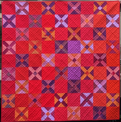 It all began with a stash of cross weaves, chosen in an intentional analogous color scheme. All of the 6.5" X blocks were made with them, using a tutorial by Barbara Black (permission granted). Background squares were added in eight solid colors, which changed from left to right across the quilt top. I intentionally left the Xs unquilted, and later went back in for some big-stitch quilting.