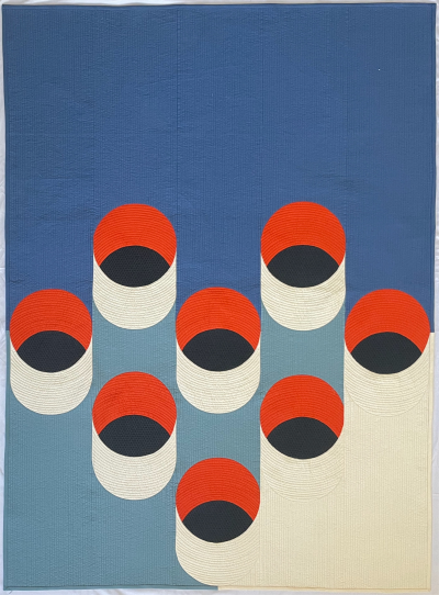 Skee-Ball was inspired by a 1979 poster called Coffee Hour by Jacqueline Casey, Massachusetts Institute of Technology. I was plaining to make a much larger quilt, but after making similar version of this for a twin-size bed and quilting it over a period of months, I opted for a smaller version. I adapted Jenny Haynes’ Twice-cut Drunkard’s Path construction method but with whole circles rather than quarters. To cut and trim the shapes and the background curves I used the Clammy 9” template by Latifah Safir. It was quilted on a stationary machine using rulers.