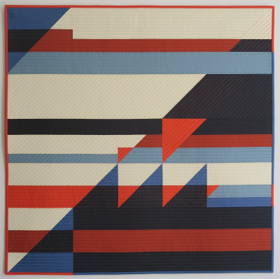 This is a design from a couple of years ago and that I first used for a mini quilt. Since then I had in mind to reuse it for a larger piece. The palette selected for this year fabric challenge was perfect to make this project finally happen. To my husband, the saw tooth shape combined to the coal and brick colours suggested industrial buildings of the 19th century. As it resonated with me, I decided to name my quilt after that idea. 'Shed' is a word borrowed from the English language and used in French to refer to saw tooth roofs in industrial architecture. Historically a part of the roof was made out of glass to bring day light inside the workshop. The quilting is a mix of horizontal and diagonal straight lines, the diagonals depicting ray of light.