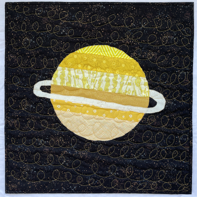 This is Saturn, and Saturn is my favorite planet and it is in space. My favorite part of how I made Saturn was making the different fabrics for the center and also the rings. I liked to quilt it with my mom.