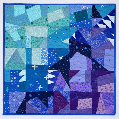 I was inspired by my mom's 100 day project and I decided to do my two favorite colors: blue and violet. My favorite parts were quilting on the longarm and making the blocks. My favorite fabric is the smiley face one. I named it Blue Origin because my dad works at Blue Origin and origin means to start from the beginning, and the quilt started with blue.