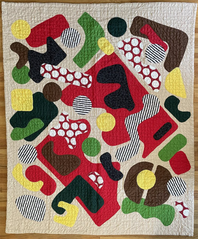 The Brown Eggs and Ham came about from the idea that fabric is my paint and hand stitching is my paint brush. I am inspired by the medium of paint on canvas. Each piece was hand cut freely with the exception of the circles (I used a bowl). Each piece is hand stitched onto the background fabric with a running stitch, and I am extremely partial to leaving the edges raw, I love the slightly unfinished look of it. I decided to use the grid pattern because it is my favorite pattern to quilt. I am always inspired by bright colors and bold prints, especially polka dots. This large format quilt is bar far one of my favorite finishes. It took a total of 6 months to complete!