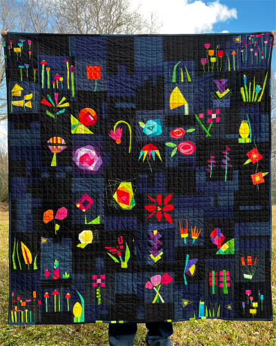 Efflorescent Midnight started as a prompt (to my bee mates in Bee Sewcial) of miniature florals in bright jewel tones with a dark background of navy or black. I asked for bits of hand embroidery on the flowers if my bee mates chose to do so (most did and I added embroidery to the blocks that didn’t have any). There isn’t a deep meaning to this quilt, it just celebrates the love of flowers, embroidery and an electric color scheme.