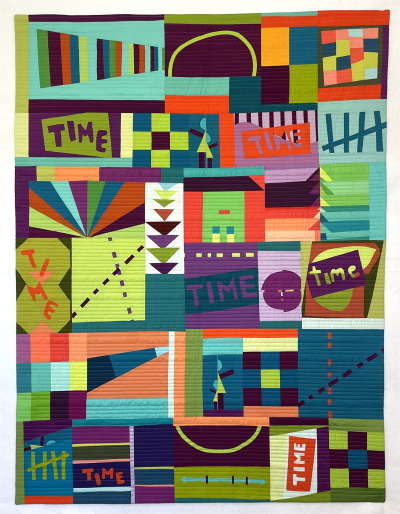 Quilts Unscripted is an online virtual Bee group focused on modern quilt design, improvisation, exploration and working in solids. Theme for this quilt was TIME. Theme prompt and palette by Carole Lyles Shaw. Members were asked to create a block with solids only using any shape or image that relates to time. From Carole's prompt: Time is not just about clocks and watches. How do we MARK time in other ways – calendars, hash marks on a wall, sundials? What do we fear about TIME? What if we really did live in a MULTIVERSE and everything is happening at once? Quilts Unscripted Block Makers: Sarah Ruiz; Chris Davies; E. A. Cox; Chris Simon; Loide Wasmund; Elizabeth K. Ray; Emily Lang; Ellyn Zinsmeister; Sarah Goer; Isabelle Selak