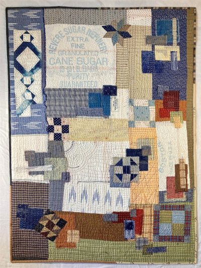 This quilt was started in a wonderful Blair Stocker Workshop. From what I have read, "Boro" is the Japanese tradition of extending the life of clothing and household items by patching and stitching. It is tradition because it is a belief, a way of life, a way of thinking. I wanted to make my version of a boro that reflected some of the techniques that I had seen in real boro items, the heavy stitching over stitching, the multiple patched areas, and the predominant colors of blue, beige and browns. I mixed new and old materials, a few pieces from the Moda Fabrics "Boro" line, a vintage sugar sack, odd pieces of homespun, some antique quilt blocks and pieces that I had collected over the years, and old flannel scraps on the back and in the binding. Many, many, many hours of loving stitches created this quilt! It's "My Boro".