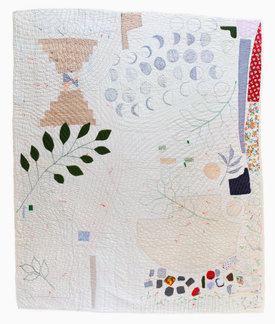 "This quilt is the first made for my ARTservancy residency at Lake Park in Milwaukee, spanning October 2020 through September 2021. The quilt touches on the unique occurence of a Halloween blue moon and the passing of Ruth Bader Ginsburg with a traditional courthouse steps block. It also notes my joy at experiencing an artists residency in Milwaukee, which I had longed to do for many years. The embroidery and applique juxtapose my memory of the leaves at the park alongside accurate tracings of the leaves, hinting at the ways my mind and memory can reconstruct the past both accurately and with gaps. It is my hope that when viewed in person, the viewer has a dramatically different experience both close and far from the quilt.