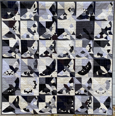 English paper pieced using the Nighttime Butterflies block. My design intent was to cause disruption and chaos by blurring the distinction between black and white, background and foreground, and by using visibly contrasting stitches throughout the piecing. I started making this as my mother was entering into her 3rd clinical trial for diffuse large B cell lymphoma. I visited her daily during her 44-day hospitalization. I showed the blocks to her early on; she asked me not to bring the quilt to the hospital, saying she didn't want it to be associated with her illness. I honored her wishes but poured my sadness into it nightly as her condition worsened until and after her death. I added hospital gown scraps to the backing as a reminder of this time together. I want to remember it was the privilege of my life to be able to support her at her end.
