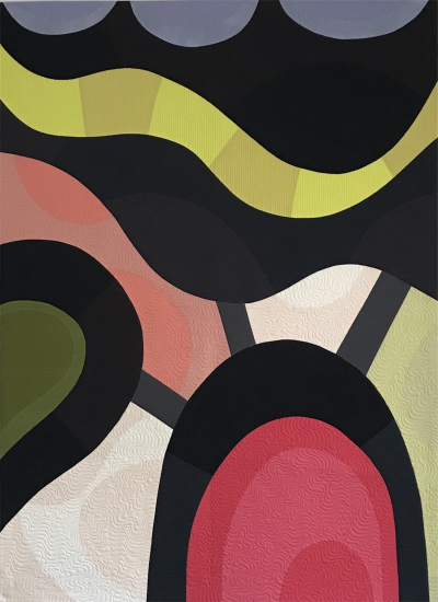 Pink Gumdrop was the second enlargement of a fabric sketch from Ohio Nine Patch. I was experimenting with value shifts and color gradations in each shape. The giant pink shape just reminded me of a gumdrop, hence the name. While I enlarged and elaborated the original sketch, I remained flexible so I could add and subtract patterning in the shapes.