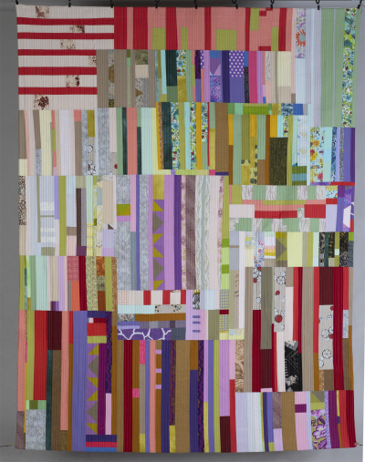 I worked on this quilt a section at a time, choosing strips from my overflowing scrap bin and sewing bits together that pleased me. It was one of the most enjoyable times I’ve spent making a quilt. Getting into the flow and deciding what felt right to put in next was a delightful experience. I was in bliss. Being a creature of structure and perfect points, improvisation has always been a challenge for me, but this quilt was a breakthrough. I am now a convert.