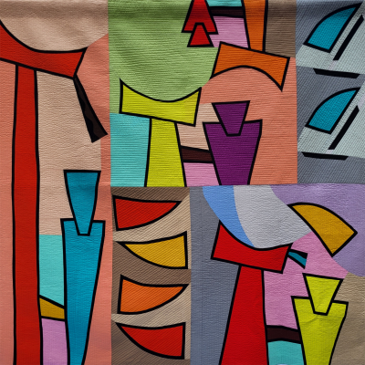 Pop! Last Fall I took a 2 week long Improvisational Class with quilt Artist, Nancy Crow, at her barn in the Columbus, OH area. It was very very intense learning with a lot of focus on color and values. It was fun also creating with other quilt artists present so we could see how each interpreted the same assignment from our teacher. This improv quilt is my main piece from the first week. The black outline of each of the shapes were reminiscent of pop art that I have seen - especially from Brazilian Artist Romero Britto, it also greatly made each of the figures pop!