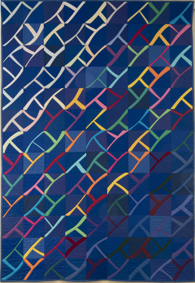I’ve been exploring simple improvisational designs and came up with this freehand-cut T shape, which I think of as a monogram block, with the T representing my last name. I’ve made a few quilts using my monogram block, but this one is my favorite so far and reminds me of a large commercial fish net.