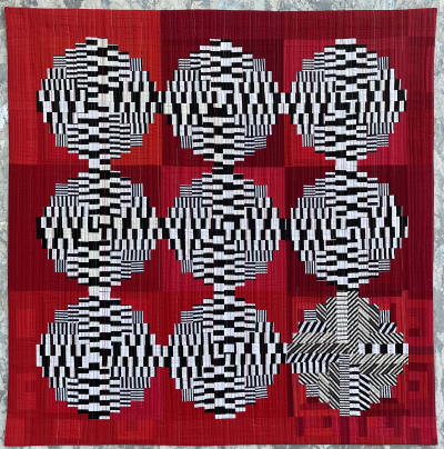 Have you ever felt the “ultimo” (Italian for last or least), the last one or one too many in a crowd of all “alike”? It can be daunting, frustrating and unsettling. The way to gracious inclusiveness is a long one. On a better note, “Ultimo” is special and unique, to be appreciated, treasured and accepted. I am always intrigued by the impact that black and white stripes have in a block or composition, the design that emerges is strong and unique. Setting it in red strengthens even the work. The asymmetric Log cabin block lent itself well to the play that the striped fabrics created. A border was created with half Courthouse Steps block in red to lighten the strong design and to be cohesive with the pattern of the Log Cabin.