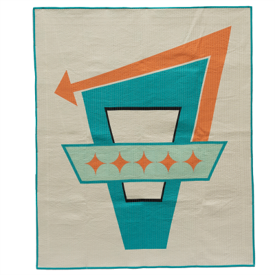 Using free clip art from ClipArtMag and the Michael Miller backing fabric for color inspiration, I created the feel of a mid-century diner. I made giant paper templates for the bulk of the design. It is quilted with my seer-sucker quilting.