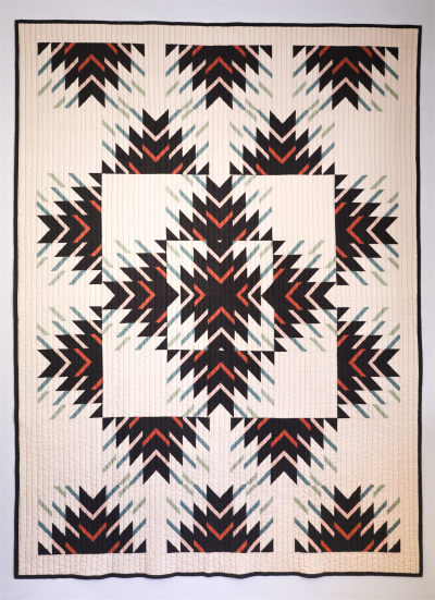 One of my favorite traditional quilts is the Delectable Mountains quilt, so I used that as the inspiration for this design. I used the same technique to make the block, but before cutting up the half square triangle, I inserted 1/2” stripes which added a lot of detail to the finished design. When I finished the first block of this quilt, it had a striking resemblance to the desert spoon plant also known as the sotol plant, which is found all over central and west Texas. They are in the family of yucca plants and have long, skinny, serrated spines. This quilt became my “Ode to Texas” because I designed it only a few months before I moved across the country. This quilt feels like home to me.