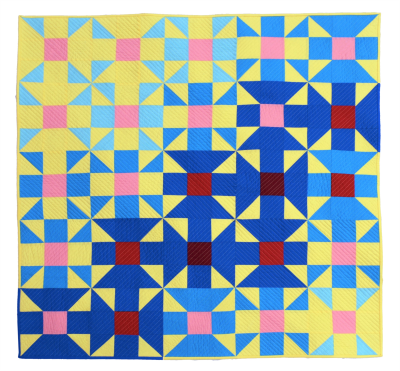 My guild had a Modern Traditionalism challenge in mid-2021. I started with the traditional "calico puzzle" block, then I played around with the color placement and block layout to come up with this design.