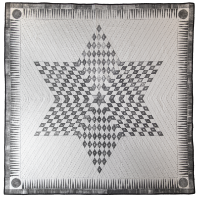 The lone star pattern has been a long time favorite of mine but I wanted to try it in a different way. This quilt only has one seam running down the center front and all "piecing" was done using 4 linoleum stamps and ink. After stamping the pattern by hand it was then hand quilted with alternating black and white thread. Distress, imperfection, and grit were all welcomed and embraced in this quilt.