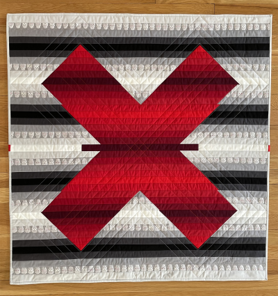 This design challenged me both in concept, piecing and quilting. There are things I would do differently if I ever repeat this design but I think we all say/think that. I rarely use the colour red and wanted my X to glow which I feel I have achieved through the colour gradations. I also enjoyed the humorous use of the little skulls fabric. I was inspired by the work of Col Jordan, an Australian hard-edge abstract artist. I have some of his work and have met him. This is my third quilt inspired by his work and each time I email him a photo. He has seen this quilt and agrees that it is an independent art work on its own merit.