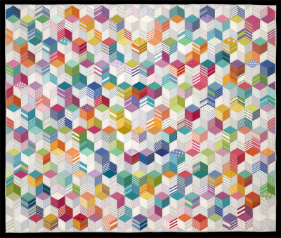 Color, like cake, is delicious. I had a ton of fun selecting colors for these iced layer cakes. The stripes are the layers; the solids and polka dots (you could call them sprinkles here) are the icing. Each cake has a lit side (left) and a shadowed side (right). There are upward-facing cakes and downward-facing cakes in a fascinating visual conundrum. The configuration I chose just happened to clump up at the center. I intentionally omitted cakes at top center and bottom sides to create a big V of cakes.