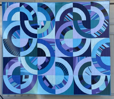 This quilt is named in after Amphitrite, the Greek goddess of the sea. I hope she likes what I have done. I tried to capture the motion and energy of the ocean for her while also embodying the ocean’s swirling beauty. This quilt is made entirely of solid fabrics that were sewn into improvised panels that were subsequently cut up and pieced into giant nested curves. Have fun following the rolling curves and swirl along with Amphritrite!