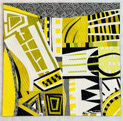 Entitled “New Beginnings”, this total improv miniature quilt utilizes many of the shapes from Irene Roderick’s “Dancing with the Wall: Improv Quilting” as the inspiration. In 2022, I set out to move away from traditional quilting and more towards Improv quilting, which took a reset of the way I think about color, shapes, flow. Thus, this quilt is a “new beginning” for me, working mostly with very bright colors and just a few print fabrics to add depth and movement to the quilt. This piece is machine quilted with canary yellow thread in straight stitching which creates movement right in the middle and moving in a diagonal outward movement. I used facing of the quilt so I didn’t stop the movement of the quilt off of the edges.