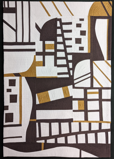 Irene Roderick's class, "Dancing With the Wall" was the inspiration for this composition. She demonstrated numerous construction ideas and this project began as a nonrepresentational piece. Then a curved section near the top sparked a vision of the curved highway in my rural hometown. A water tower and railroads emerged as well. The butterscotch patches represent landmarks such as the hospital where I was born. This abstraction provides many memories.