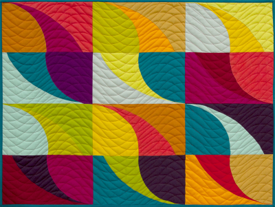 I made two earlier quilts (Tilt-a-Whirl and Himalaya) with an original block design made up of a half circle and a quarter circle. In this quilt I took that block and cut it in half and repeated it.