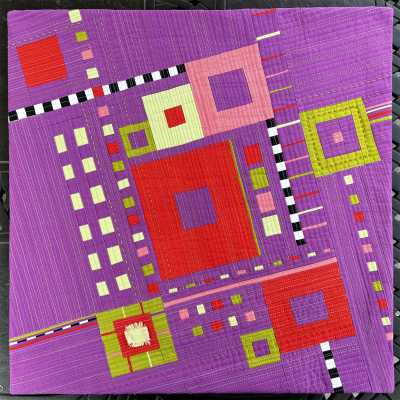 Imagine seeing some space junk floating in the cosmos with the satellites. This is my vision. Space Junk was improv pieced and matchstick quilted with some big stitch quilted accents. There is a little nod to my grandma who taught me how to sew and create. Maybe you made some fringed napkins with your grandma too. Look carefully! This quilt was inspired by Maria Shell’s polka dots and originally made for the 2022 Kona Color of the Year (Cosmos) Mini Quilt Challenge for my local guild.