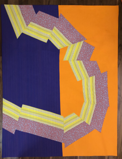 Minimalist design with one broken curve winding its way across the two tone background. I I created this improvisationally by draping the fabrics at the design wall with no pre planning or templates. designed in angles and pinch points so that the draped prints make interesting interactions with the background. The tension created fits with the recent years of stress where we've been crushed by periods of darkness relieved by intermittent hope. It's entirely pieced - there is no applique. Cotton fabric, cotton batting. Matchstick quilted on my longarm. Pieced and quilted with Aurifil thread.