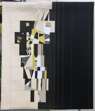 During the summer of 2022 I took part in the 30 days of improv sewalong on Instagram hosted by Amanda @broadclothstudios and Shannon @shannonfraserdesigns. It was all about exploring different ways of practicing improv piecing and experimenting with different shapes. My fabric choice consists of an old pair of trousers, some corresponding solids and a striking print from my stash. I dived into cutting without a ruler and without a plan. Such a liberating process! In my quilt designs I always have a minimalistic approach, seeking for sharp crisp shapes and a stark contrast. For the dense quilting I used 28 weight Aurifil thread.