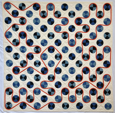 My quilt was inspired by a combination of diagrams of machine belt paths, the pegs of a plinko game board, and testing the bending limits of bias tape. The pieced circles were hand appliquéd onto a pieced field of vanilla custard, followed by quilting and binding, and finally the mandarin colored bias tape "belt" was hand appliquéd onto the quilt using the appliquéd circles as guideposts.