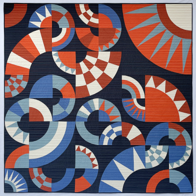 Oranges above and blues below give the impression of an abstract seashore, while the spikes and swirls evoke stars in the night sky. This quilt began as a way to play with wheel/fan blocks, and ended by taking me on an unexpected longarm thread tension odyssey! After much joy followed by much frustration, I am happy to have escaped mostly unscathed but with many lessons learned for the future.