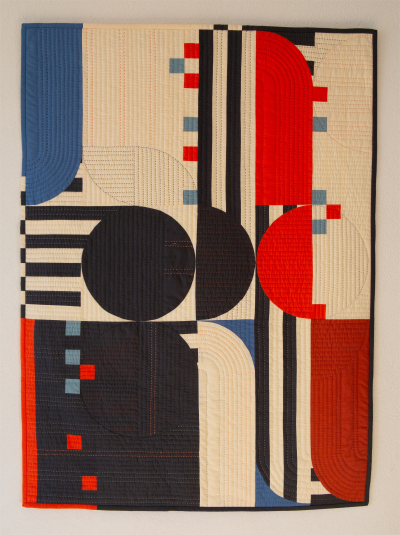 Starting a quilt is a pleasure. "Pop Up" is a modern study around the Windham Ruby and Bee fabrics challenge proposed. - I worked on the staging of the colors with a drawing combining whole or partial circular forms and bicolored stripes. The small squares complete the rhythm of the whole. - The hand quilting made with threads of different colors and materials underlines or suggests new shapes. - I chose to underline some parts of the design with the binding