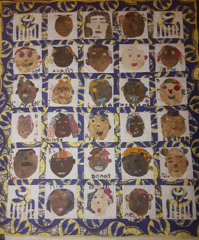"We Are Enough" is a collaboration between 26 3rd grade students from WJ Bryan Elementary in Miami, Florida. The students read a book entitled "I Am Enough" by Grace Byer's. This book helped them to realize that they are smart enough, strong enough, talented enough, disciplined enough, determined enough and beautiful enough. Students realized that they are beautiful in the skin they are in. They created self portraits that they appliqued onto quilt blocks and their teacher pieced it together. The students chose the sashing and border to represent their school colors. They worked with African fabrics to help connect them with their heritage.