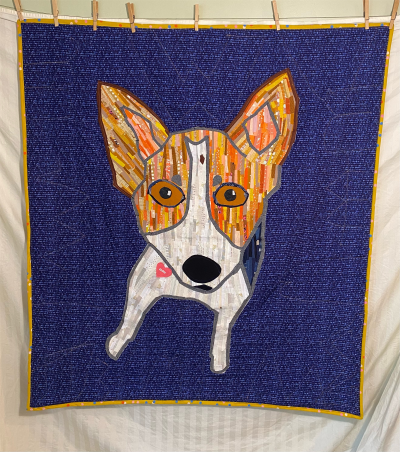 We got Maxine April 17, 2020 during the pandemic. She makes me feel better. She sleeps with me, snuggles with me, and I train her on Saturdays with Wonder Dog. She has inspired me to draw, paint, sculpt and sew her image. I would like to whittle her next. For this quilt, I pieced her with strips of cloth and machine quilted Ms for Memphis (where I’m from) and Maxine.
