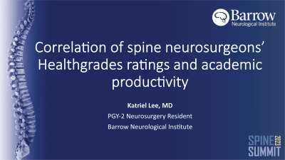 Introduction: Physician rating websites (PRWs) are increasingly utilized by patients to find providers. Previous studies have shown that social media presence and completion of a fellowship are associated with higher ratings for neurosurgeons on PRWs. This study specifically analyzes spine neurosurgeons’ ratings on HealthGrades and correlation with academic productivity.