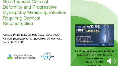 Conclusion : We present a unique case of a previously healthy patient presenting with progressively worsening myelopathy, neck pain and severe jaw pain in the setting of a dental abscess and severe focal cervical spinal deformity, found to be gout.